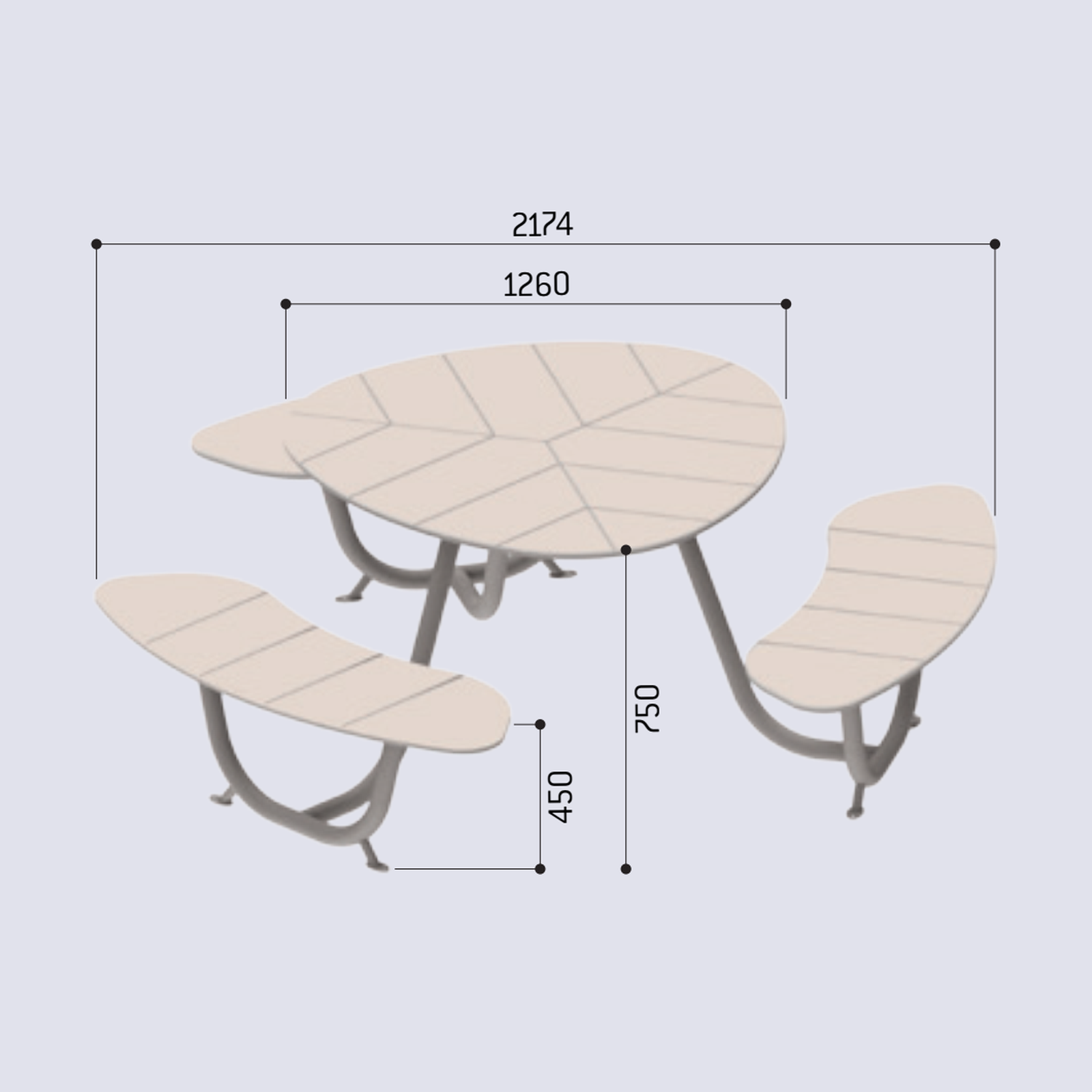 Rozměry: stůl průměr 126 cm, celkový průmě 217 cm